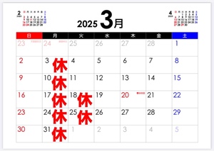 3月の定休日のお知らせ!!3月に限りまして、月曜日+第3第4火曜日が定休日となります。皆様にはご迷惑...